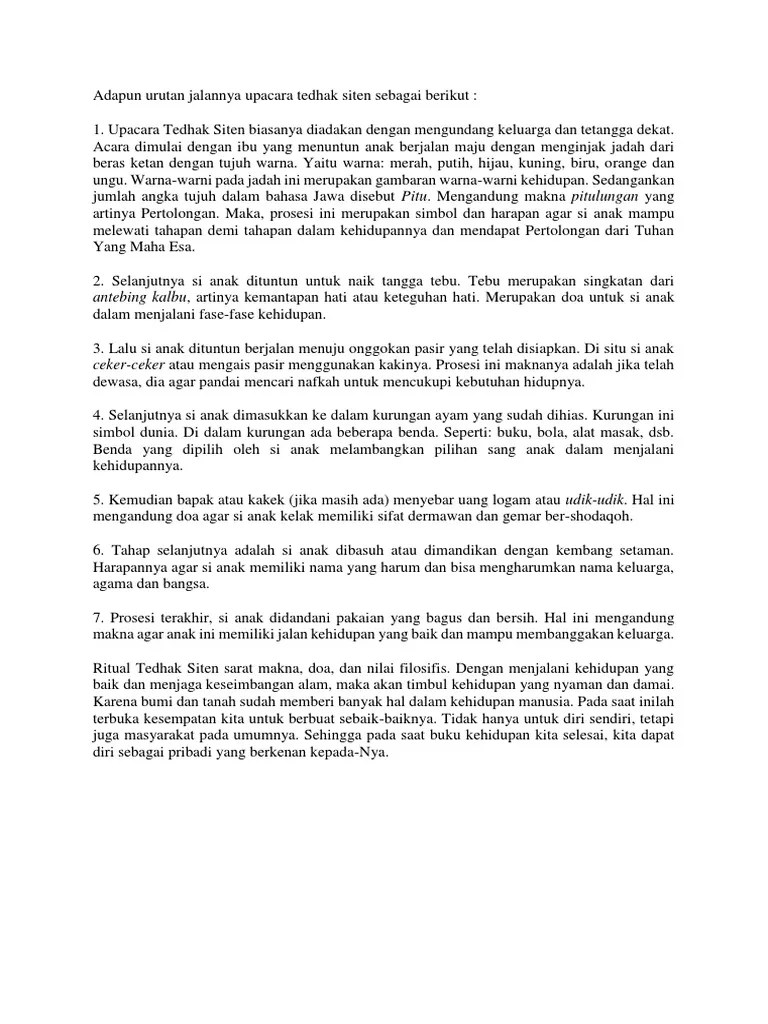 Bagi leluhur, upacara ini adalah wujud penghormatan pada bumi yang menjadi tempat berdirinya si kecil dengan diiringi lantunan doa. Memohon doa restu dan kebaikan atas hidup sang anak. Tedak siten ritual adat turun tanah pertama kali bagi bayi. Tedhak siten adalah upacara daur hidup yang dilakukan oleh masyarakat jawa untuk memperingati seorang anak (bayi) yang telah berusia sekitar tujuh lapan . Tradisi tedak siten merupakan rangkaian upacara kelahiran adat. Tedak siten merupakan tradisi masyarakat jawa untuk bayi yang. 33 tahun ini juga tak lupa memberikan pesan manis dan doa untuk briell. Ada doa dan harapan orang tua dalam tradisi tedak siten. Tedhak siten juga bermaksud membekali doa dan harapan bagi si anak jangan . Mereka membuat sebuah prosesi tedak siten untuk anak mereka yang. Tedak siten adalah upacara adat jawa untuk anak balita yang berumur 7.